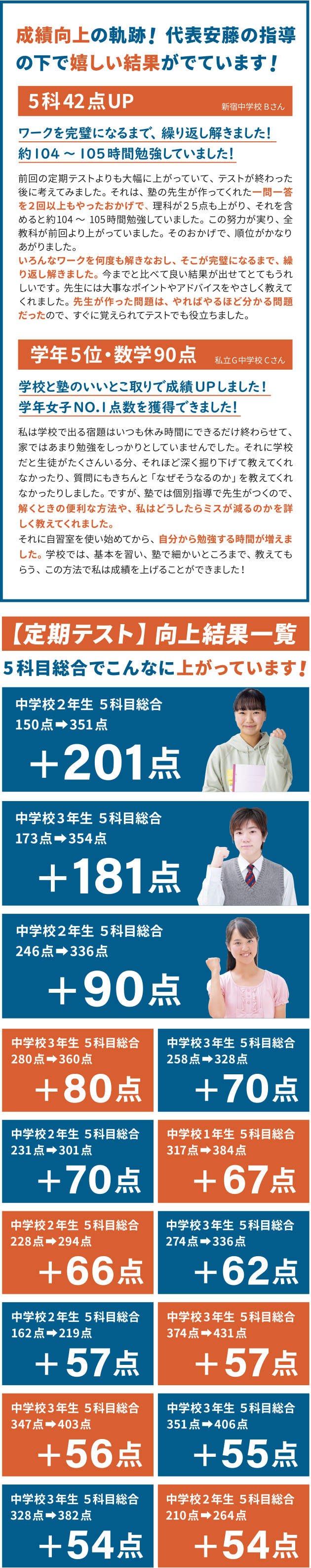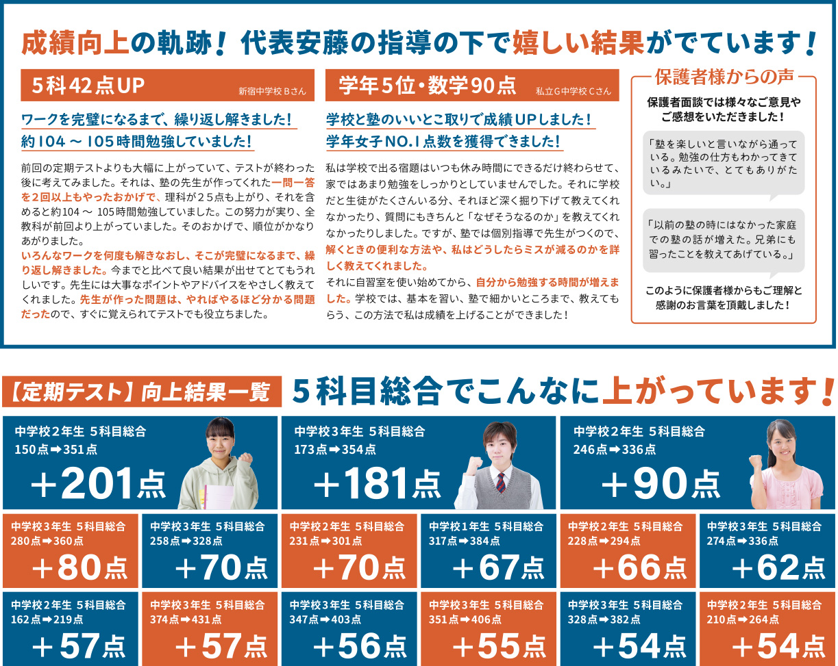 中学生は私立中学校、新宿中学校、葛城中学校、末広中学校などの学校・学年ごとに出るテスト範囲に合わせて
